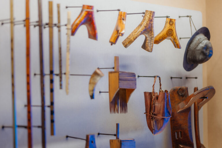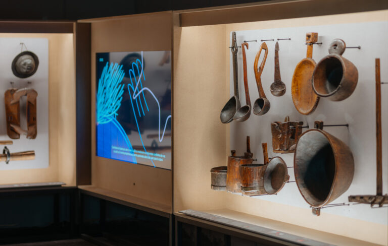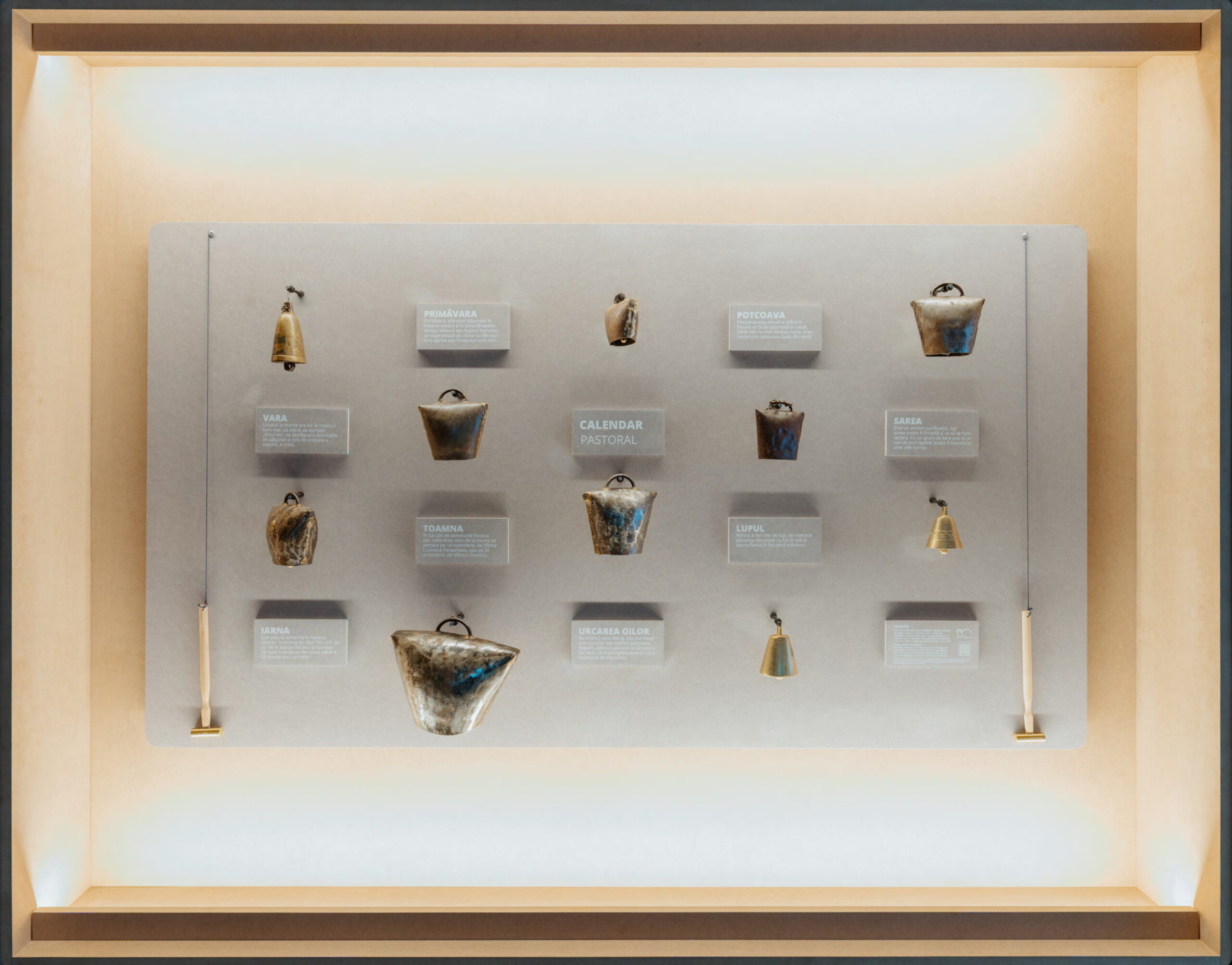 The geography of the flocks’ itinerary from the village to the sheepfold and back is depicted in a diorama, where we can see the sheep’s journey but also the dangers they encounter as they pass through forests, past waters and villages, all populated by spirits or negative characters who can steal the milk. The diorama has a background animation illustrating the changing seasons and mirrors mounted on either side that make the recreated universe seem endless, helping to immerse the visitor into the story. An album with photographs capturing the life of the Maramureș shepherds adds a very concrete dimension to the symbolic elements of the diorama. The identity of the herdsmen and the objects they handle begin to take shape. The exhibition also includes some of the objects specific to shepherding, the stars of which are bells of various sizes, which can be struck with small metal hammers, the resulting sounds giving the impression of a herd in motion. Hence, the visitors can contribute to the sound environment of the exhibition. The soundscape – made up of whistling, bleating sheep and singing shepherds – is enhanced by the bell installation, which becomes an empathetic gateway into the world the exhibition captures.